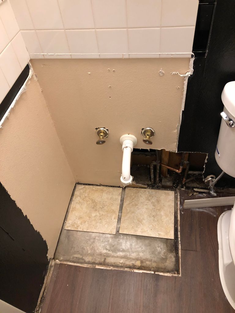P.S. The plumber just left (the repair cost about $300, plus we’ll have to repair the drywall ourselves) and this is what my bathroom now looks like: