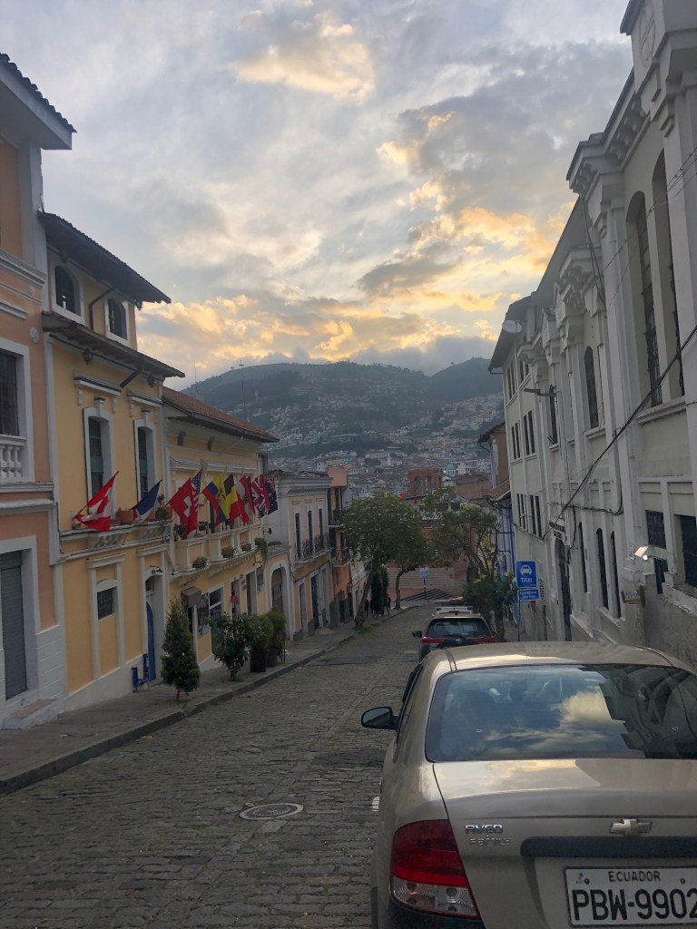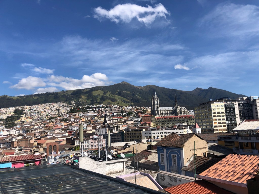 We flew into Quito on a red-eye and immediately collapsed into bed the night (erm, early morning) that we arrived. We stayed in the Secret Garden Hostel in Quito and the next day enjoyed breakfast on the rooftop enjoying the expansive views of the city and surrounding mountains.